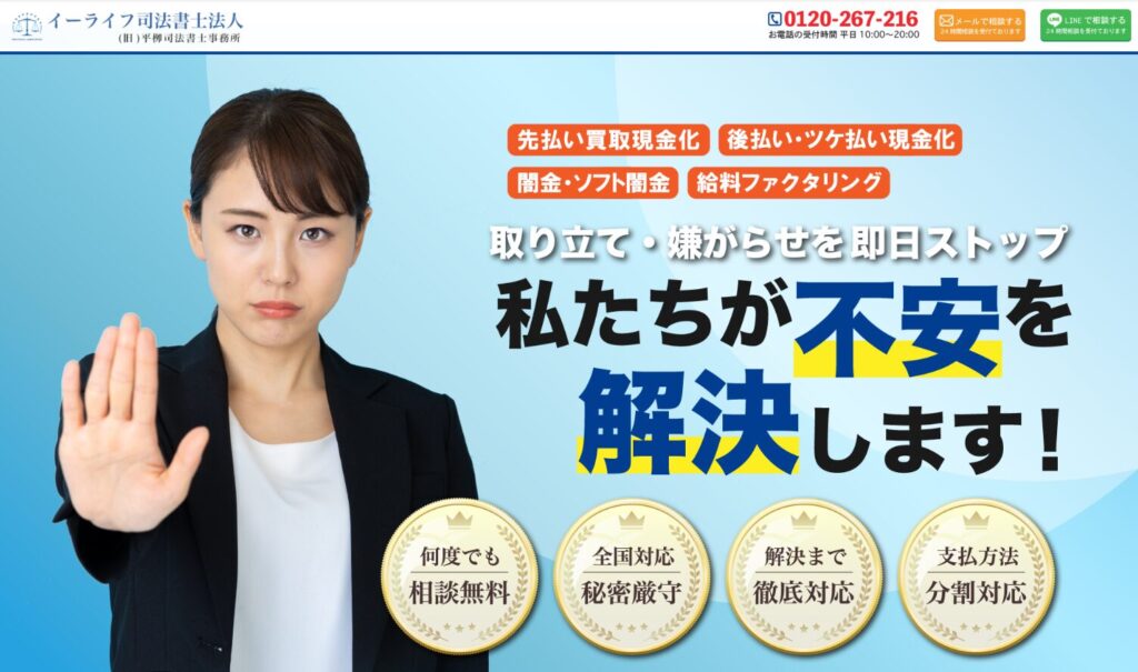 イーライフ司法書士法人は、闇金トラブルの即日解決を得意とする司法書士法人です。