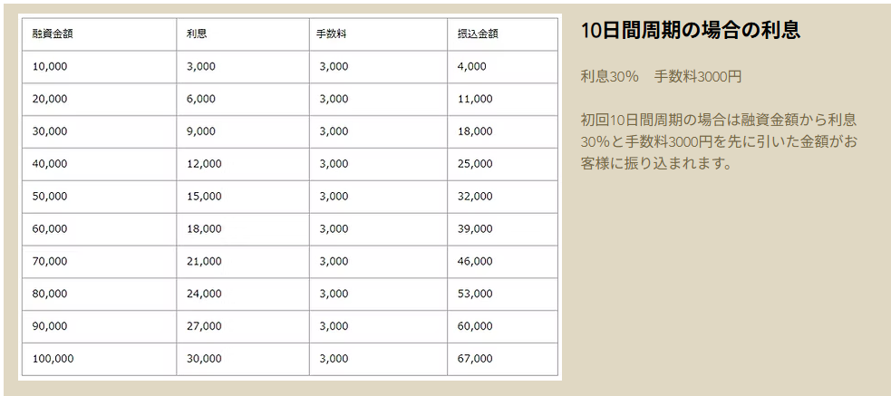 ②10日間周期の場合:利息30%、手数料3000円