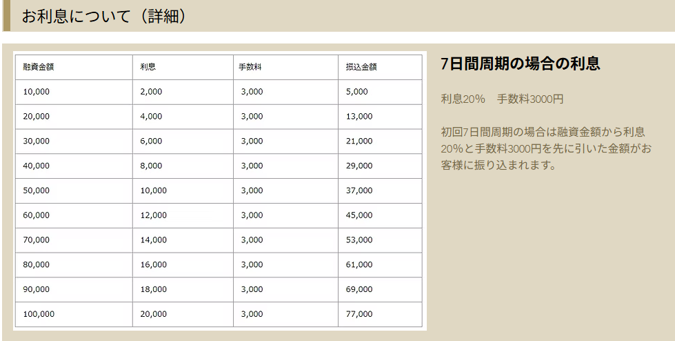 ①7日間周期の場合:利息20%、手数料3000円